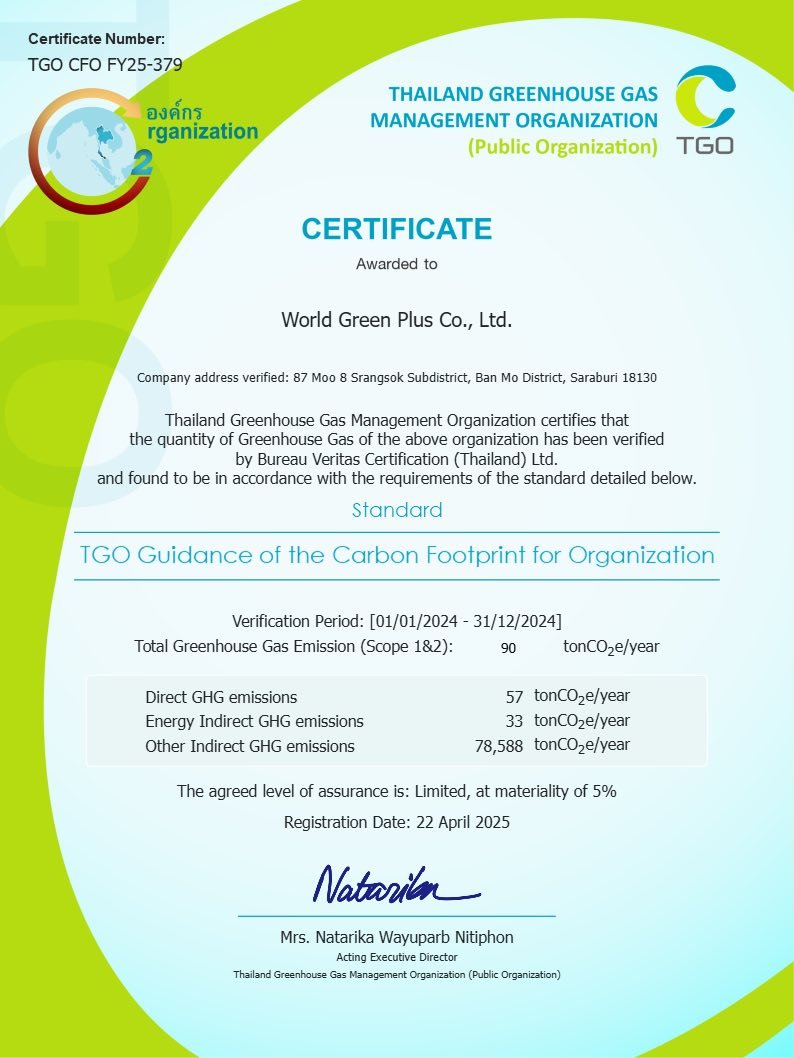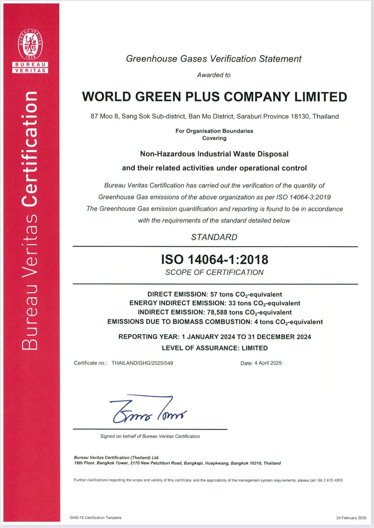 บริษัท เวิลด์กรีน พลัส จำกัด ได้รับการรับรองตามมาตรฐาน ISO 14064-1:2018 จาก BUREAU VERITAS ก้าวสู่มาตรฐานสากลด้านสิ่งแวดล้อม สะท้อนความมุ่งมั่นในการลดคาร์บอน และขับเคลื่อนธุรกิจอย่างยั่งยืน ️WORLD GREEN PLUS ผู้นำด้านการจัดการของเสียภาคอุตสาหกรรม มุ่งมั่นสู่ความยั่งยืน ด้วยหัวใจแห่งความรับผิดชอบต่อสังคมและสิ่งแวดล้อม